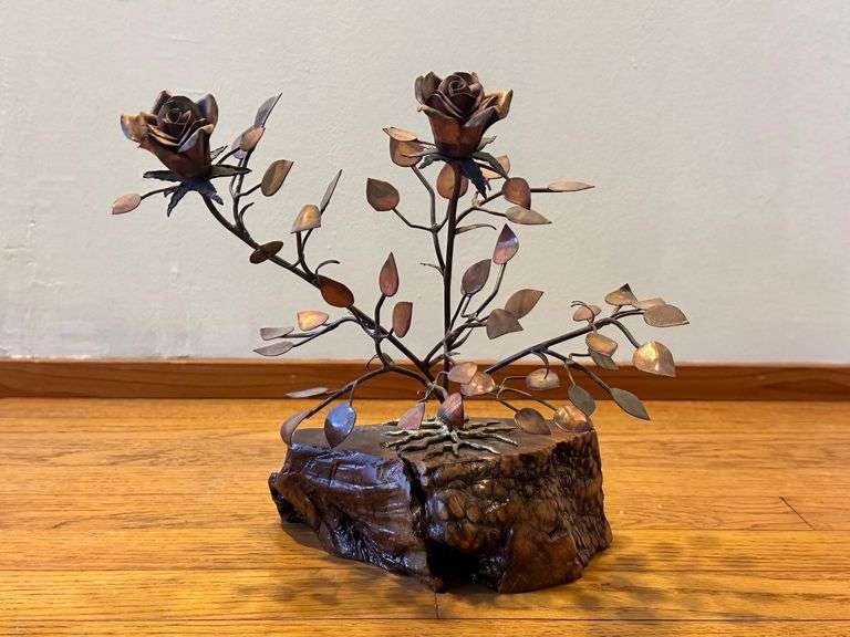 Copper handmade floral arrangement in a polished slice of wood. 10” high. Made by locally respected ‘Magaw’ family - traditional artists from Boston, Indiana. 10” high. About 30 years old, kept indoors. ‘SW” signature engraved.