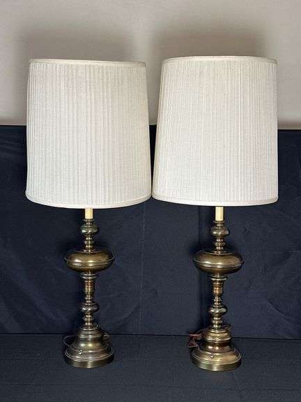 Electric table lamps, featuring turned brass bases with a classic design. Each lamp comes with a pleated fabric shade in off-white.