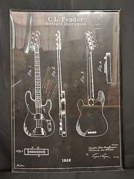 Framed poster featuring a patent diagram of a C.L. Fender stringed instrument, credited to inventors Clayton Orr Kauffman and Clarence Leo Fender. Includes technical drawings and annotations, dated 1952.