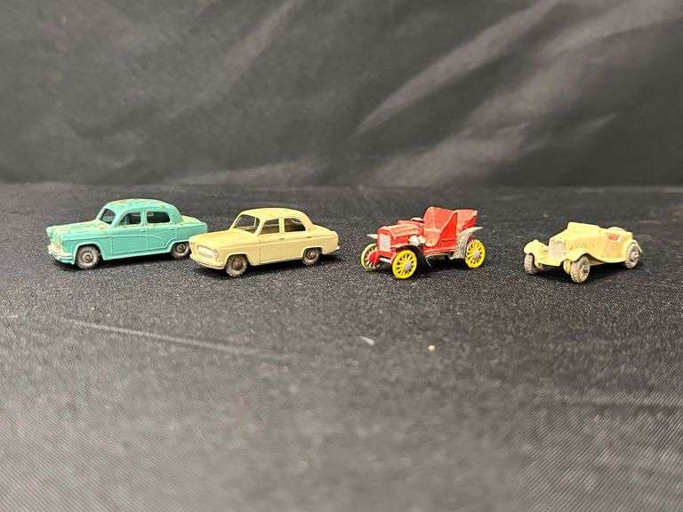 Four vintage die-cast toy cars by Lesney, made in England. Includes models labeled ‘Austin A50’, ‘Ford Prefect’, and two other vehicles.
