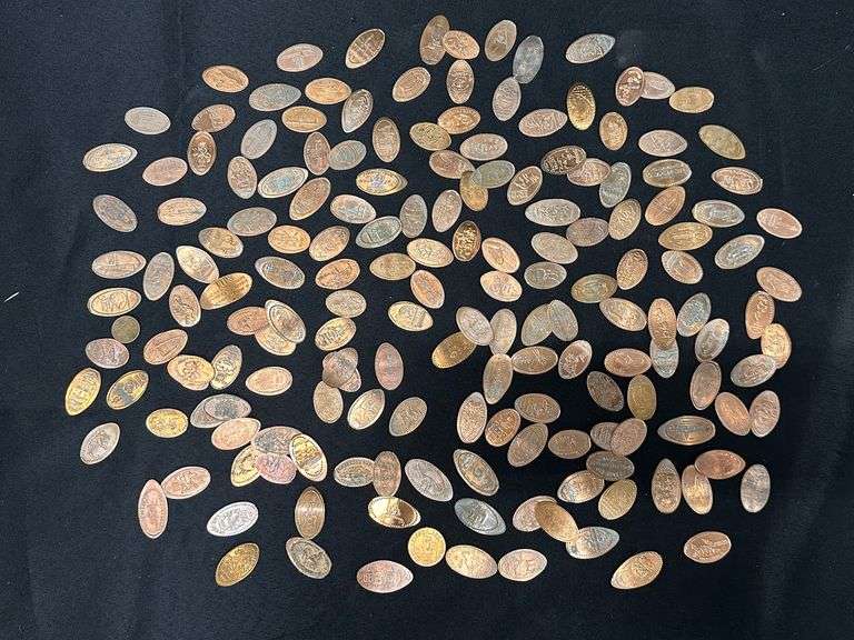 Pressed elongated souvenir coins featuring various designs. These coins are typically created by imprinting designs onto flattened coins as mementos from different locations or attractions.