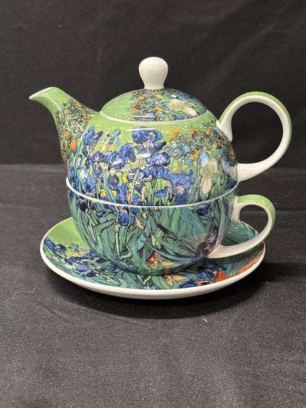 McIntosh porcelain tea for one set featuring a design inspired by Van Gogh's irises artwork.
