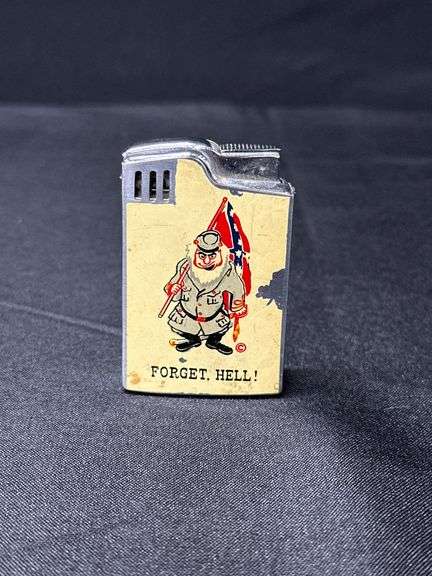 Music box lighter featuring a Confederate theme. One side displays a character carrying a Confederate flag with the text "FORGET, HELL!" below. The reverse side shows the Confederate flag in red, white, and blue.