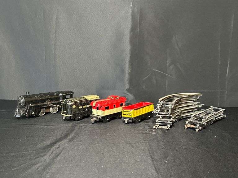 Tinplate electric train set includes a locomotive, tender marked 'New York Central,' red passenger car marked 'NYC 20102,' yellow freight car marked 'BALTIMORE & OHIO,' and a set of curved and straight tracks.