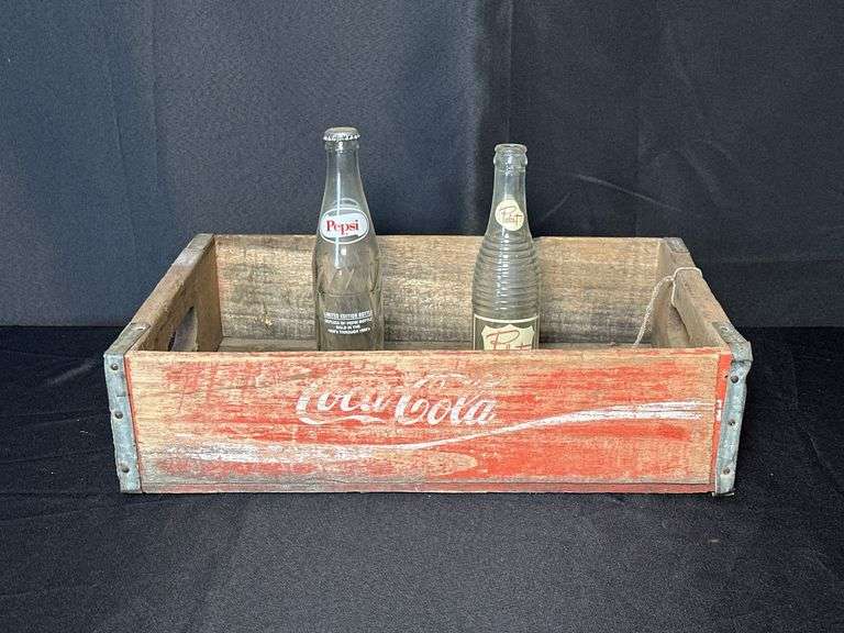 Wooden Coca-Cola branded crate featuring red paint and metal reinforcements, along with two vintage-style soda bottles. The first bottle is a Replica Edition Pepsi bottle, marked with its production details. The second bottle is an 8 FL OZ Pabst Beverage bottle, labeled accordingly.