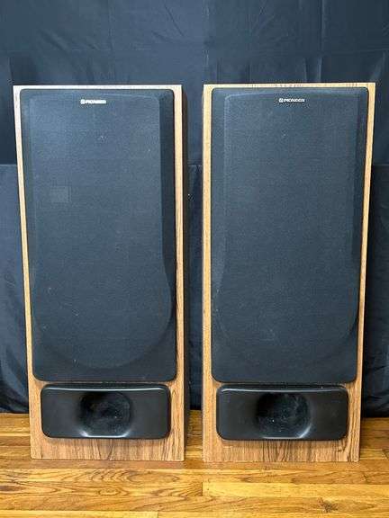 Pioneer floor-standing speakers featuring a colored vinyl laminated wood enclosure. Designed with a speaker grille and horn-style detailing on each unit.