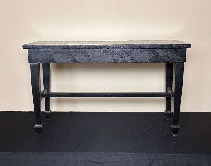 Rectangular wooden storage bench with a black painted finish. Features a hinged top that opens to reveal an interior storage compartment.