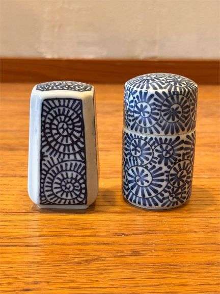 Blue and white ceramic salt and pepper shakers featuring a geometric floral design. Includes one rectangular and one cylindrical shaker with a removable top for refilling. Both pieces are a similar pattern, making them a harmonious pair. Contemporary, about 5 - 6” high, bought in Kurashiki, Japan in the late ‘90s.
