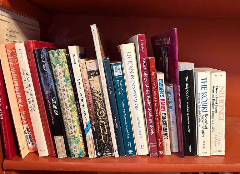 A diverse collection of books focusing on topics related to religion, culture, and history. Included are titles covering Buddhism, Islam, Christianity, Shinto, Japanese aesthetics, and archaeology.