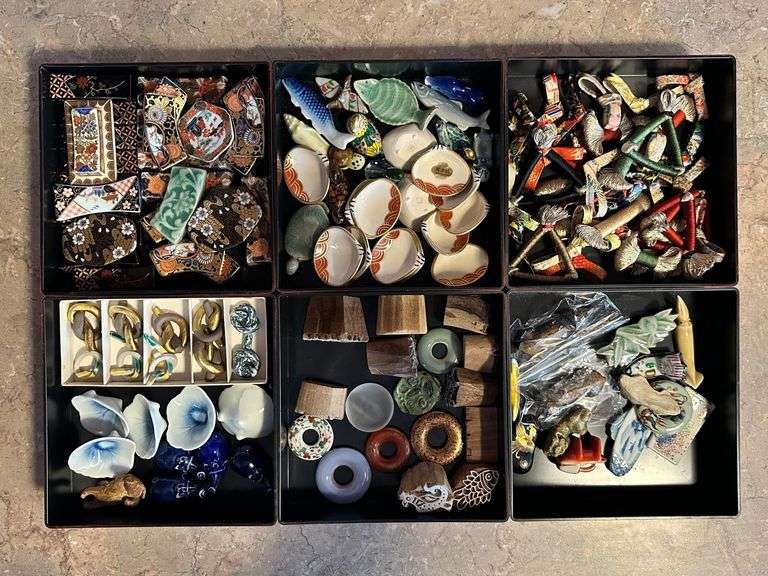 Extensive Collection of hashioki, for resting the used tip of Ohashi, Japanese chopsticks. The ability of the Japanese to constantly invent new forms and materials for the little hashioki,‘chopstick pillows’ is staggering. There are a number of very valuable hashioki in this collection of more than 100 pieces. They are stored in a traditional jubako, stacking boxes, made of the very high quality plastic that the Japanese have developed which is informed by their long tradition of gorgeous lacquerware.